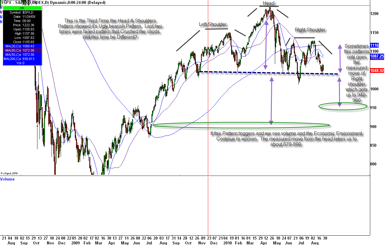 If the U.S Economy continues down this path of little or no private sector growth, nearly 10% unemployment (or an even higher rate of underemployment), there is no wealth creation, and the continued overdose of government control continues, I see no reason why we can’t see the measured move from the head to neckline which would take this market down to the 870-890 area.