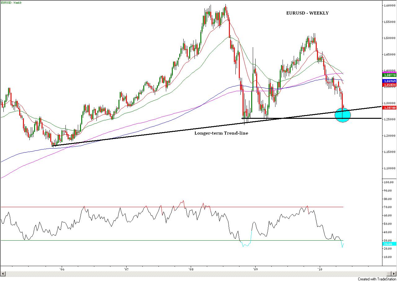 3. Equity markets have recently traded closely with the Euro for obvious reasons, thus making it every bit as important to watch as it does the major Indices. Last week, the EURUSD traded down near the 1.25 level which is support created in 2008-2009 and a longer-term trend-line.