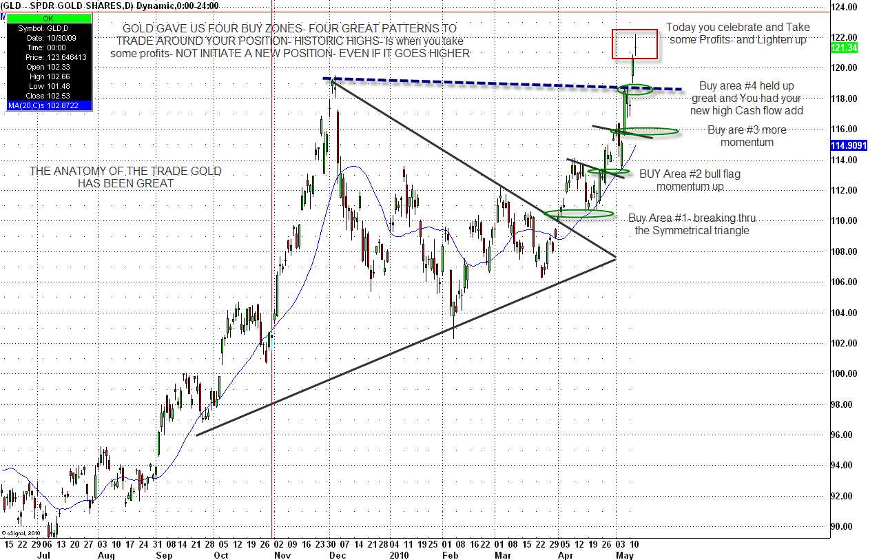 Strong stocks or strong groups usually pull back to their 10day or 20day, and if technicals remain intact they hold those levels. Look for that scenario in Gold.
