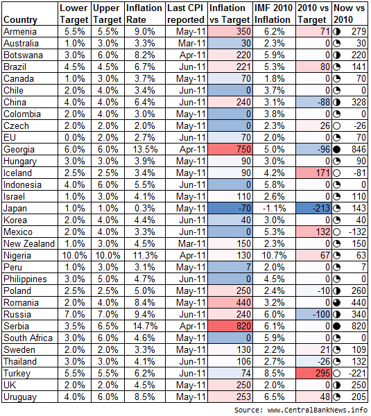 The chart below shows the change in inflation versus target, between the most recently reported inflation figures and the end of 2010 inflation figures (from the IMF). Of the 32 countries, 23 saw inflation go above target, or go higher above target, 4 saw inflation falling closer to target (2 fell into target range), while 5 saw inflation staying within target.