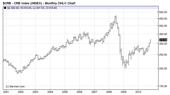 For the inflationists, if they’re willing to not shoot the messenger on this one, Paul Krugman has two great blog posts succinctly summarizing the commodity inflation story. In his post yesterday he shows that commodity prices are very volatile and milk and gas, two oft-cited consumer needs, are not higher than prices pre-2008 crisis. The chart below shows the CRB Index, the best way of measuring the broad moves in commodity markets. At a glance it is clear that even if the 2008 oil bubble is removed, prices are not even back to the highs in 2006.