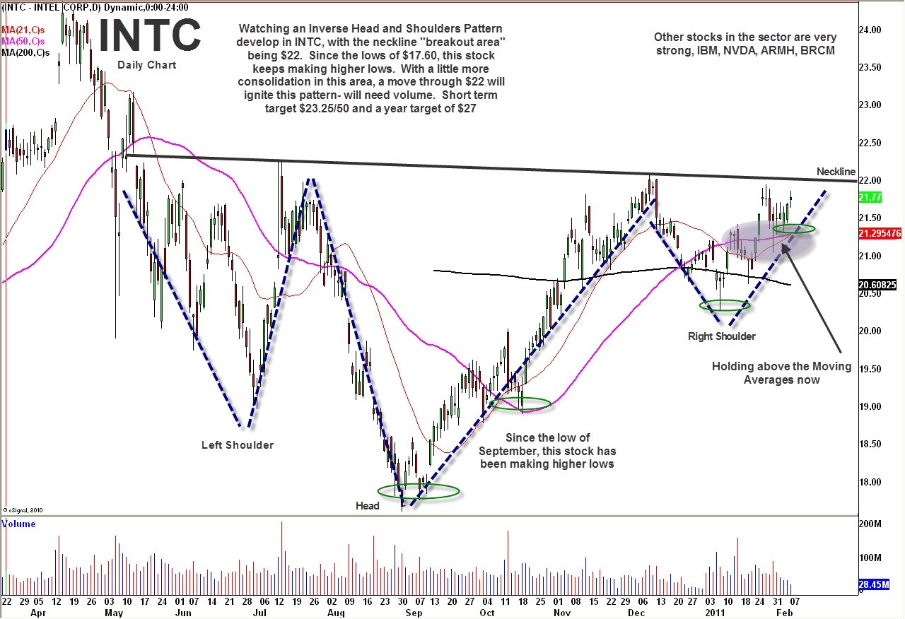 Technically, Intel looks poised for a large measured move. If you look at the daily or weekly chart, you can see the stock has put in a head and shoulders pattern over the past year with a neckline at $22-22.50. The measured move would see Intel run to around $26.