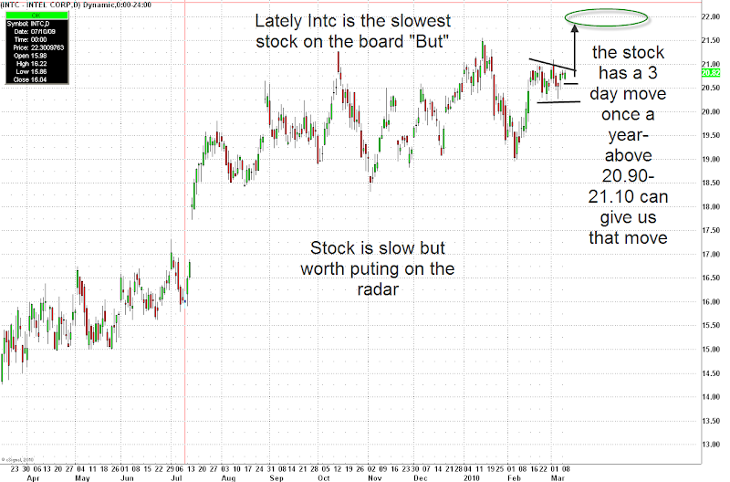 But, after two quarters, no traction and lots of frustration, Intel (INTC) could be ready for a move. It happens about 3 times a year and when it does, it is completely worthwhile.