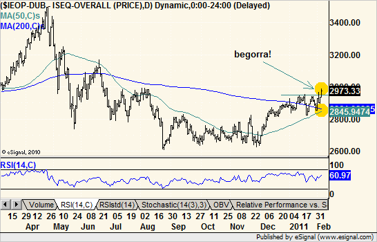 Uncategorized Irish Eyes? Feb 4, 2011 Are they smiling or drunk on liquidity? Look at this chart: That is a breakout! Not to mention a golden cross is just about in place. This follows breakouts in several of its PIIGSy pals. Crisis over! Who wants to by a bridge?