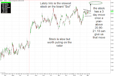 We are running out of big breakout type moves, so the patterns and the trade change. Yesterday, I posted a chart of Intel (INTC) to highlight that longer-term breakout shaping up. Here’s that chart again: