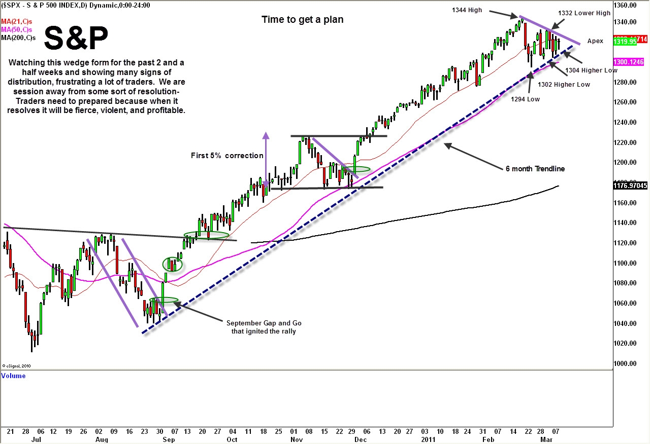 US stock futures are set to open lower Thursday, following Asian and European markets that slid overnight, although they are paring some overnight losses this morning. There were several catalysts for the drop in foreign markets: rising oil prices due to escalating violence in Libya, South Korea raising interest rates, Moody’s downgrade of Spain’s sovereign debt rating, and an unexpected trade deficit in China. With this morning’s weakness, most signs point to a downside resolution to the wedge pattern that has been building for the last twelve trading days. Check out the timeline of the wedge pattern.