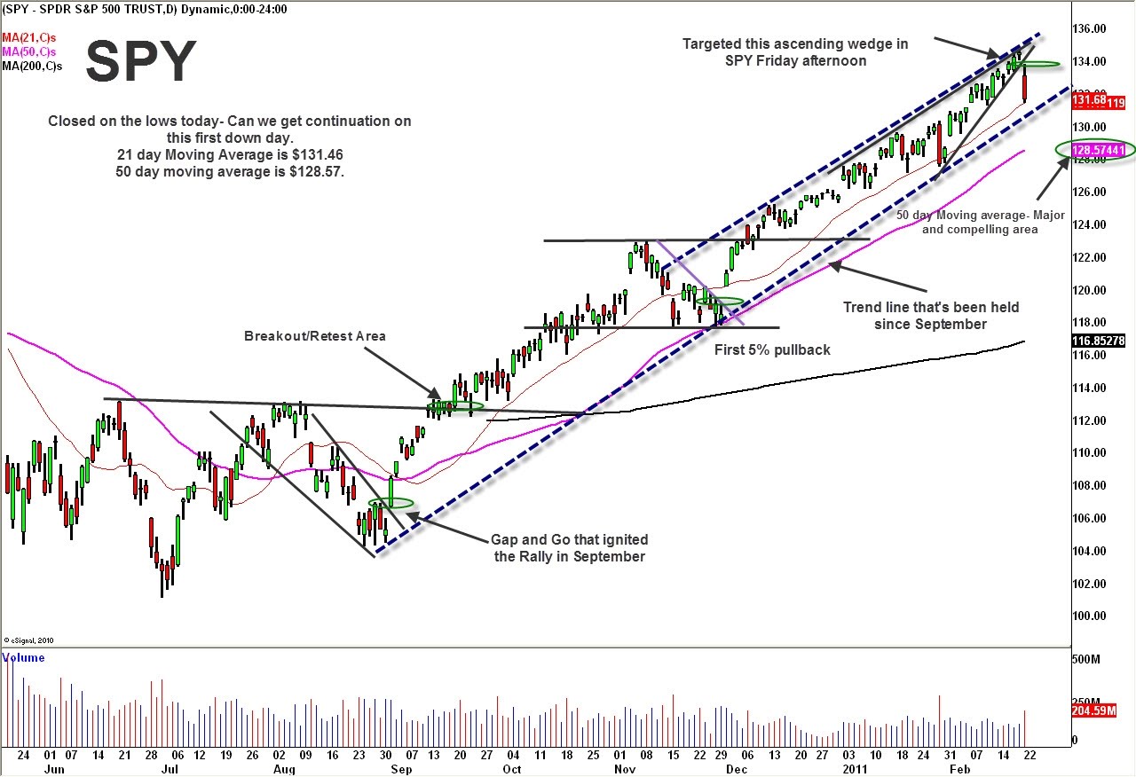 Apple Inc. (AAPL) got hit hard yesterday as investors continue to be cautious due to Steve Jobs’s tenuous health. The stock closed the session right at big support at the lower trendline of the uptrend since late September, which also coincides with its 50-day moving average. Last night AAPL drifted below that level, but this morning has recovered those losses and more, set to open four points higher. The company will also be in focus Wednesday as it has its annual shareholders meeting.