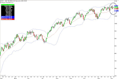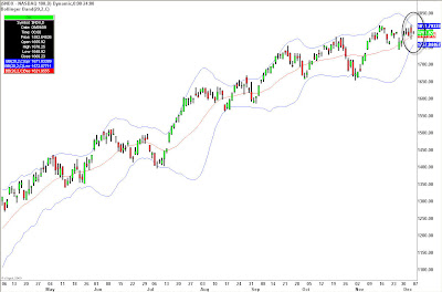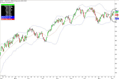 A trading strategy that many traders use for locating momentum trades is to watch when the Bollinger Bands for a particular market or stock “pinch” together. In this instance, one of the factors relevant to the change in character is a period of lower volatility prior to the establishment of a new trend. The price consolidation in the stock should result in a pinching or contraction of the bands. Think of this as a coiled spring preparing to explode.