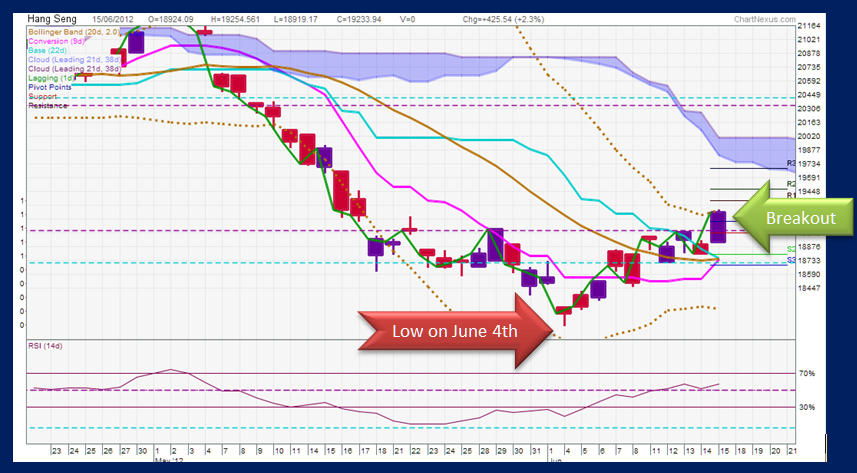 By consensus, the ‘Greek election’ was the key factor supposedly moving everything in the markets. On the surface it may look like that, but global stock markets are really out of sync. The Hang Seng, for instance, recorded its lowest point on June 4th, and has since been moving up gradually. The index displays clear signs of a breakout pattern, above Bollinger Bands, above Fibonacci pattern and above previous resistance levels in May.