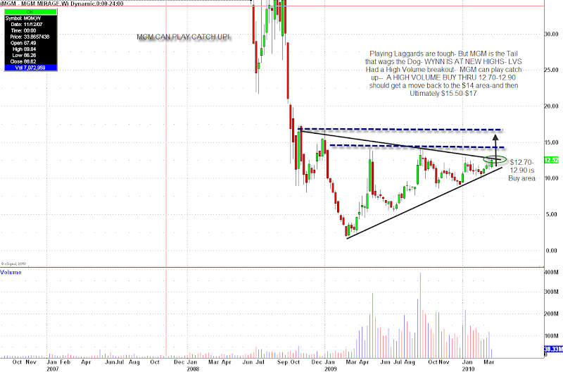 I hate playing laggards, BUT Wynn is at new highs and should see $80-90 area, and then $120 later this year. LVS had a Rock Star breakout on volume yesterday. It looks to have follow-through to $23-24 then on the weekly chart we can see $30 this year.