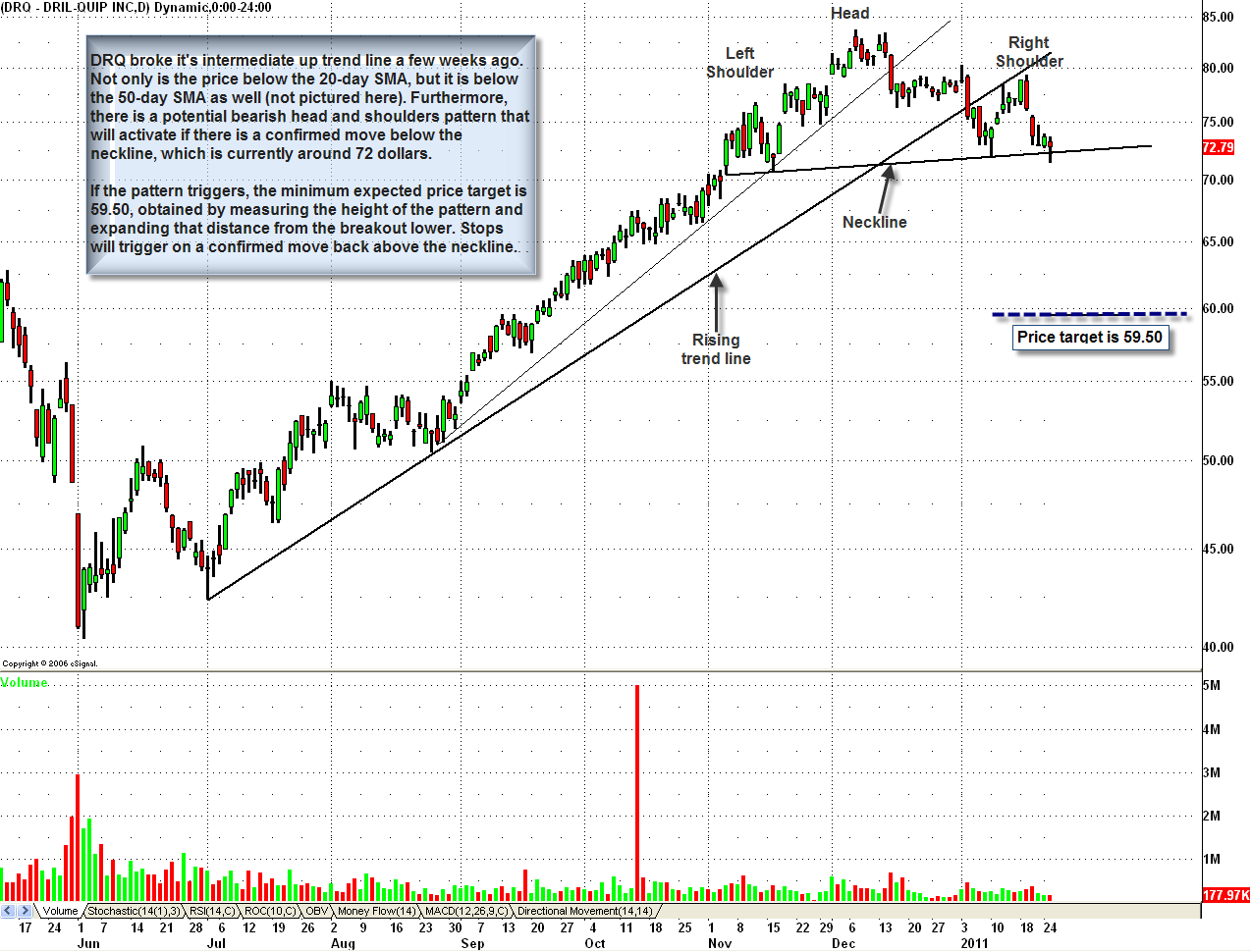 Chart 4: Illustrates a potential bearish head and shoulders pattern on DRQ that will trigger on a confirmed move below the neckline. Target: $59.50, Stops: Confirmed move back above the neckline.
