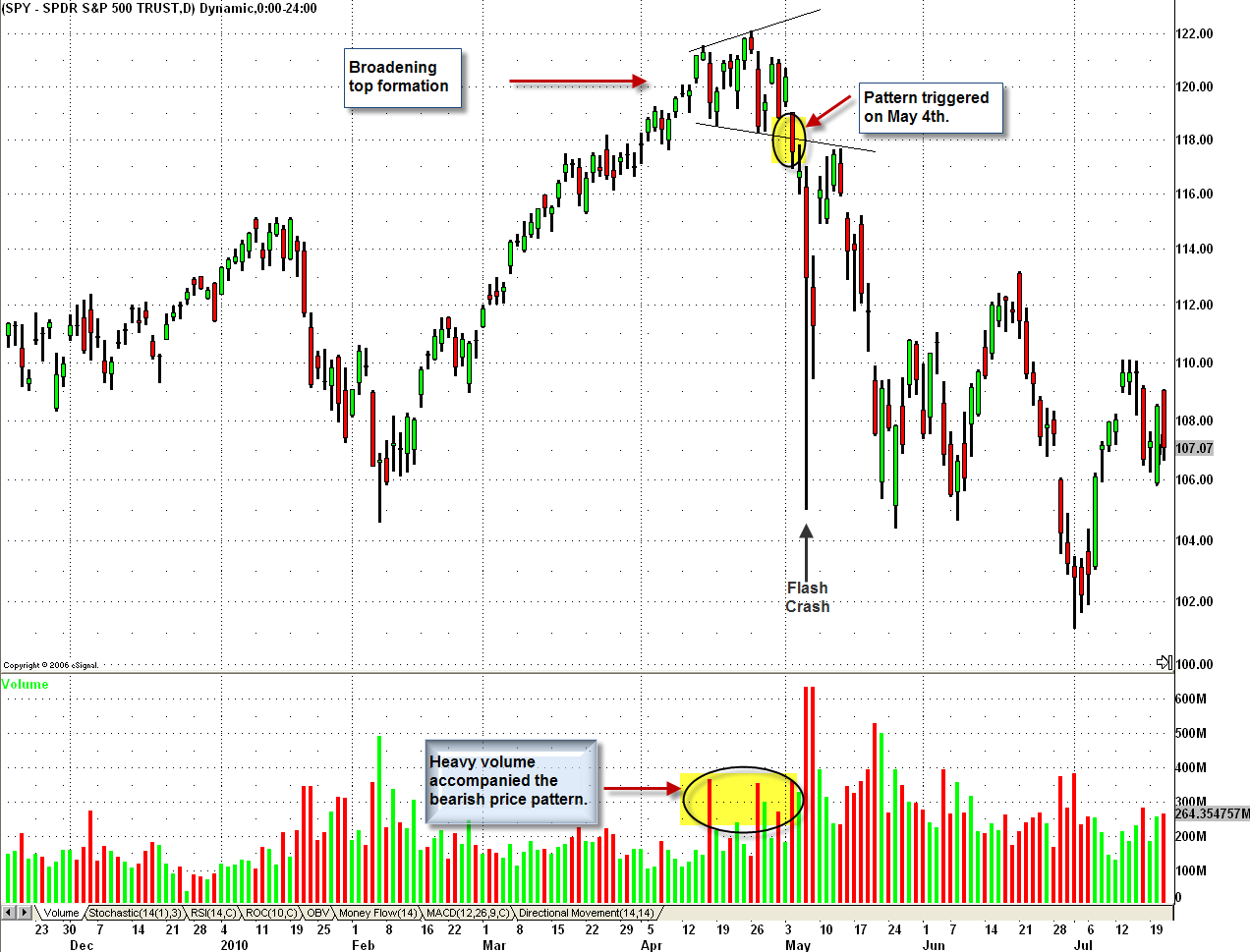Chart 2: Below is an example of a broadening top formation, that triggered in SPY two days before the “flash crash” on May 6, 2010. When this rare type of pattern triggers, there is usually a very quick down move that follows.