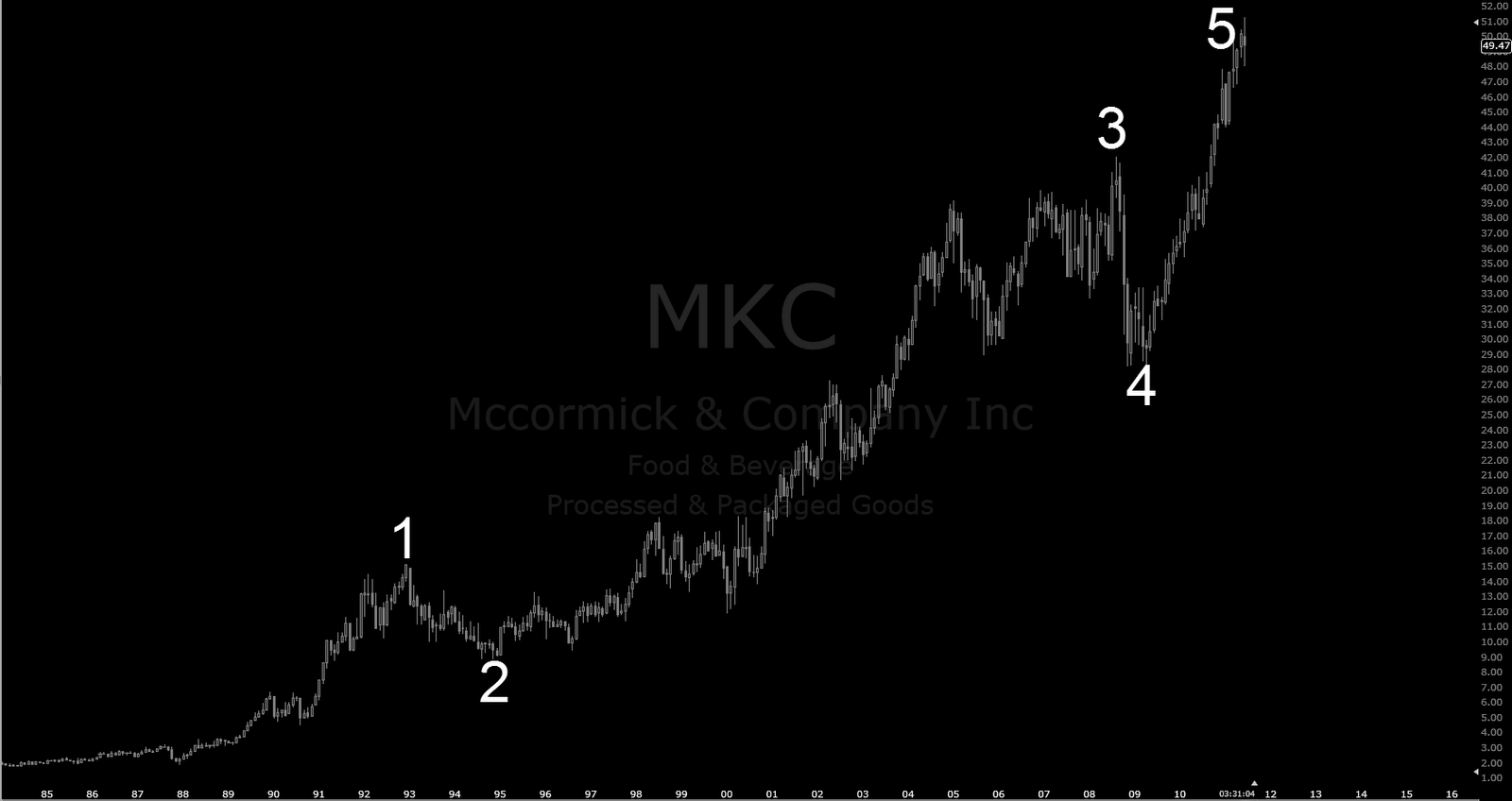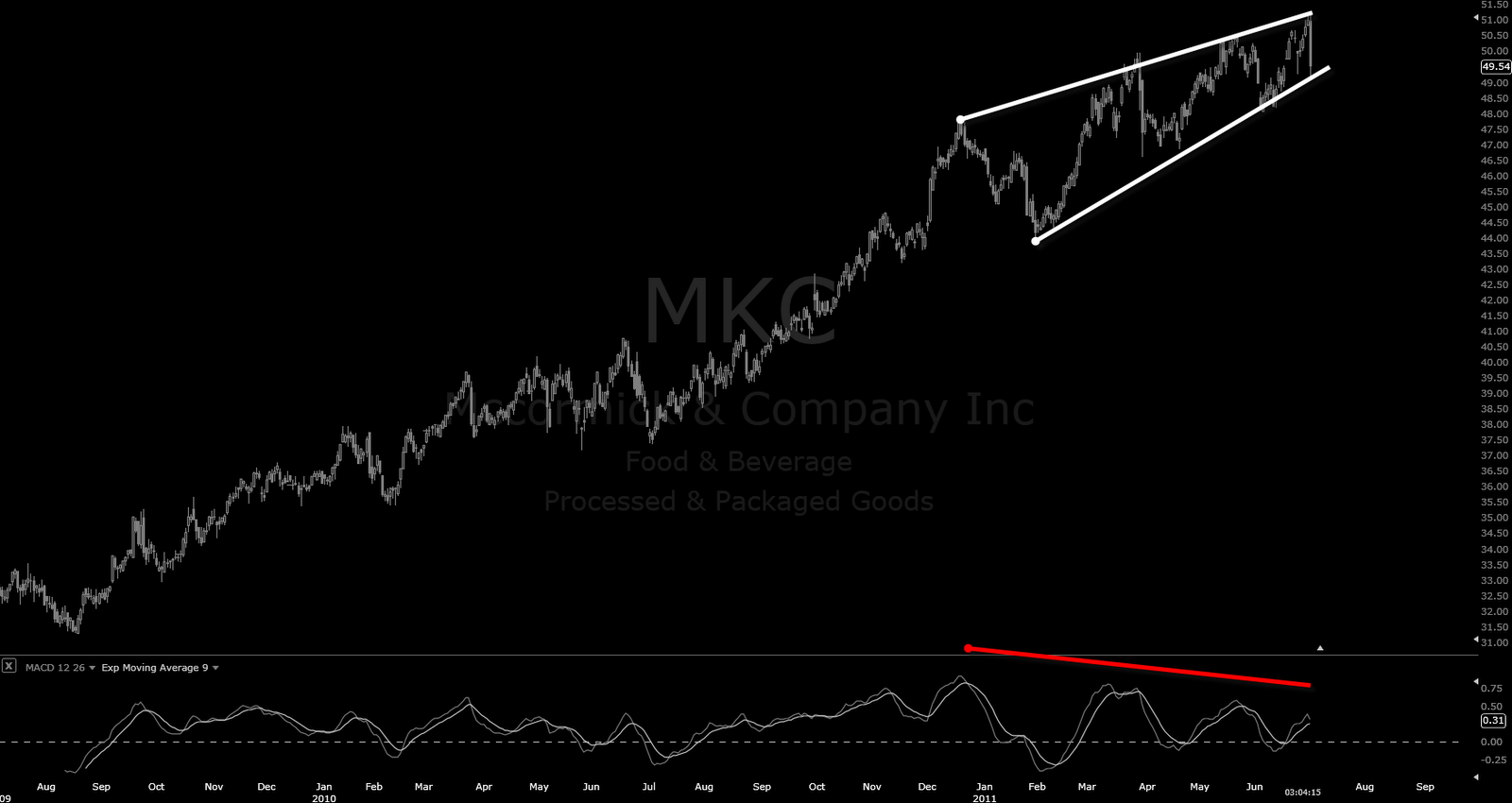 Stocks MKC – McCormick Jul 2, 2011 I shorted MKC today. It reminds me a bit too much as ending diagonal. I think it might be missing one more zigzag for it actually but will test what it will do. There should be 7 touch for ideal case, not five.