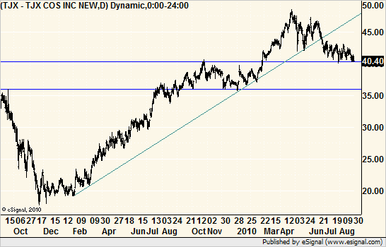 Off-price apparel and home fashions retailer, TJX Companies (TJX), owner of the Marshall’s and TJ Maxx chains, reported better than expected earnings on August 17and raised its outlook. Its stock barely moved and now sits on a very important support level below where it was before releasing its good news.