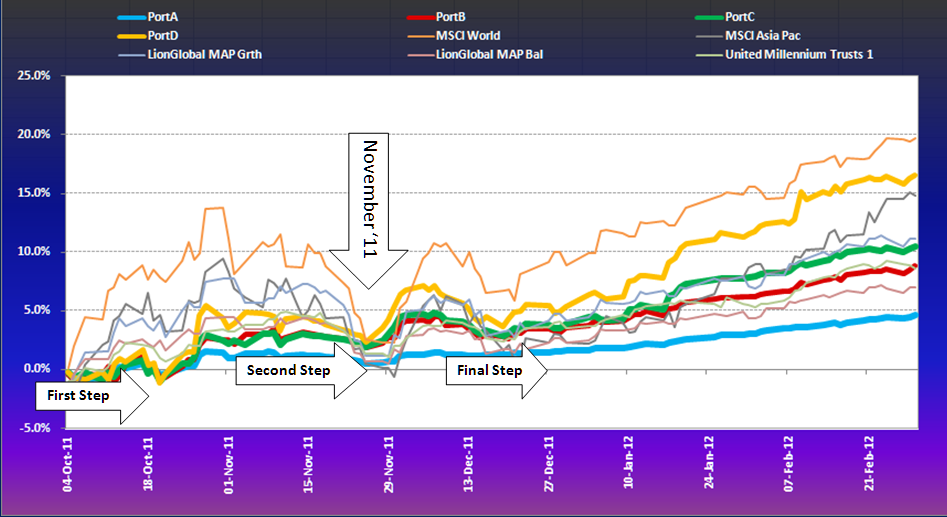 The exit in September 2010 may look tepid. The MSCI World kept rising till February 2011, so did the Asian indices, but to a much lesser degree. And yet, at the same time the Singapore Dollar also rose to 1.20 against the USD. Safety therefore may not have produces a firework of returns but having secured a nice margin against benchmark funds and the MSCI Asia ex Japan, we slept rather peacefully.