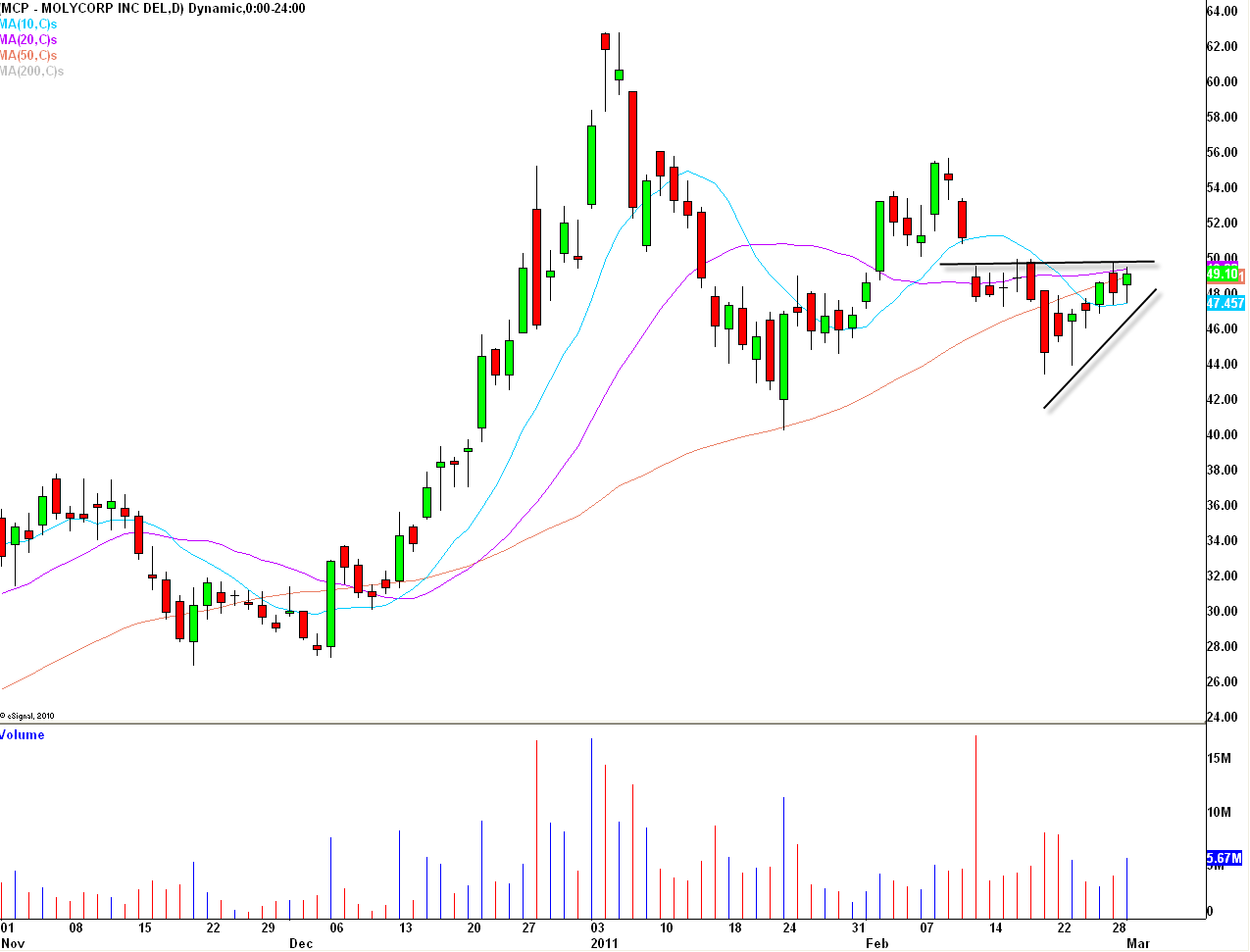 I haven’t traded the rare earth sector much this year as the group has quieted down somewhat and not presented compelling patterns. Rare earth is a very speculative play, but can provide great moves for active traders. Right now, group leader Molycorp, Inc. (MCP) is forming tight wedge consolidation that usually precedes a big move. Usually wedges are continuation patterns, so we are looking for a buy in MCP through the upper trendline.