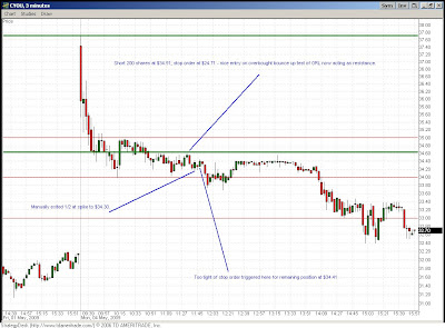 Of course, the stock plunged soon after, and didn’t even hesitate at $34.00 (my price target) dropping all the way to $33.75ish. Moving my initial order to breakeven after a .30 cent price change is following my plan as letting a winner turn into a loser is a key part of my risk management strategy. Covering half of my position with a .21 profit is technically against my rules, but is acceptable violation. But not letting the rest of my position at least play out when I had a profit locked in seems is a great sin (: in my book! I had a breakeven stop order in for the rest of the position – just leave it there to play out buster. I will post an annotated EOD chart tonight.