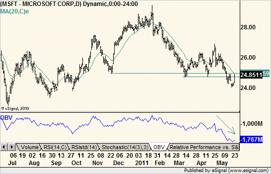 Check this out. The trend is still down and today’s rally did not even break the 20-day expo average, let alone something more important. Next, on-balance volume is still falling. Today’s volume was not exactly a barn burner.