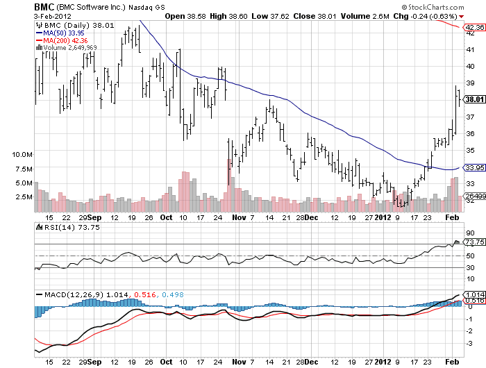 We bought BMC (software) on Wednesday. Why? It had a range breakout, was above the 50-day average, had good volume and recently broke a trendline to the upside. Not to mention the market was going up, too.