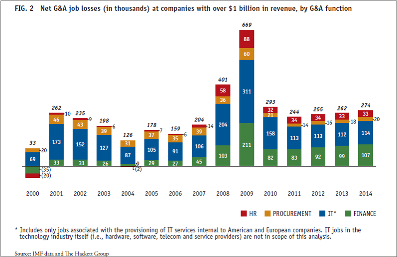 Based on a new study by the Hackett Group, close to 1.1 million jobs in corporate finance, IT and other business functions were lost at large U.S. and European companies in 2008 and 2009 due to a combination of offshoring, productivity improvements, and lack of economic growth.