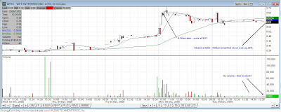 The aforementioned Bacon Eaters sent out an alert on Monday at 9:56am extolling the long potential of poker company WPTE….insider trading, great technicals, higher volume – buy, buy, buy! Then they sent an email today claiming it was still up 20% from their alert. Yeah right!
