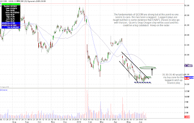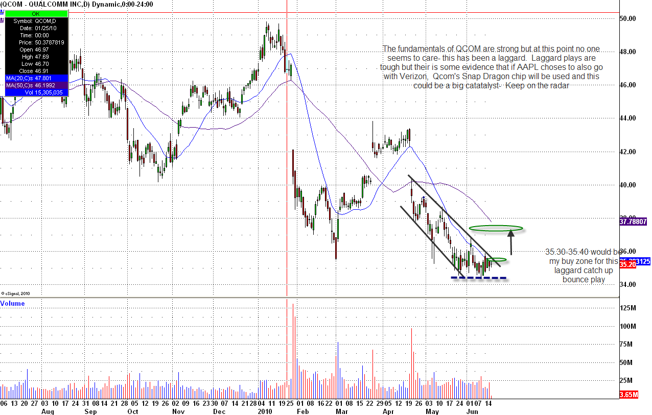 We see an opportunity for a laggard play in QCOM. Technically, the chart looks set up for a bounce, with 34 as the big support area. If QCOM can trade thru 35.30-35.40 with volume, we can see an easy move first to the 36.50 area, and next to 38ish. Put your stop for the trade at 34.