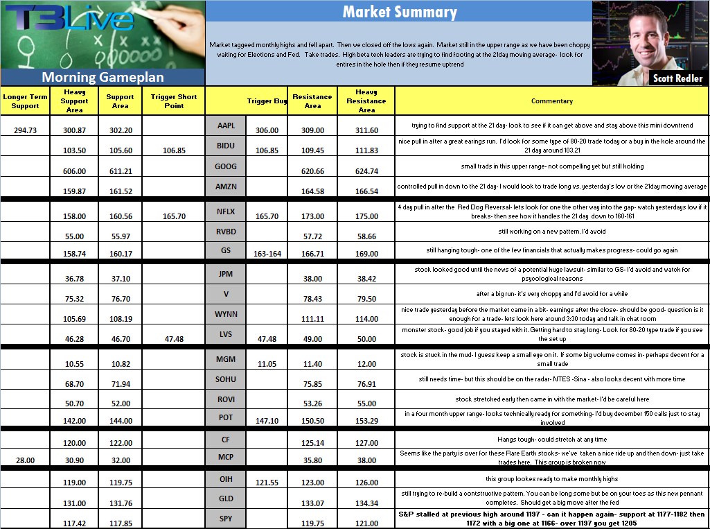 As you can see on my price point sheet, there are always 22-25 stocks listed. You cannot expect to watch all of those stocks off the open, so you have to do your homework to prioritize them based on your strategy. Some stocks have better set-ups than others, and I rank them A-C. A: has clear, decisive pattern with good consolidation and an actionable area that also provides a defined risk-reward parameter. These are the ones I watch off the open and am ready to put into play. B: a pattern is starting to set-up, but it needs more time to build a base or digest a move before I feel confident in attacking the trade. If all goes to plan, with more time these will become A set-ups. C: these are trades that are choppy or laggards, which I don’t like to trade. Sometimes there will be a decent pattern with a laggard and I will denote it as a C type of play, which means I may give it a try but I will do so in small size with very tight stops.