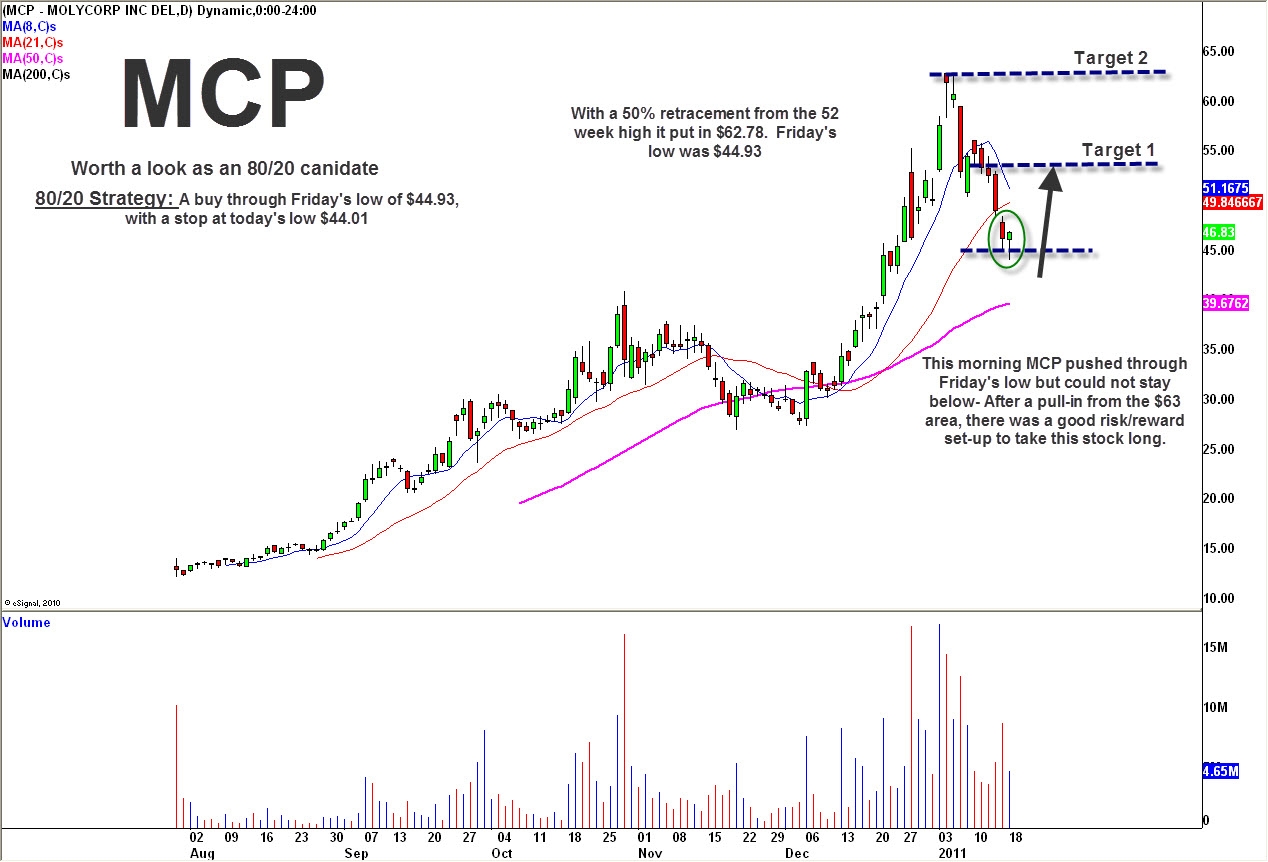 After staging a reversal today, I believe MCP can see a bounce back to $53-54 area. If you missed the buy today you can target a buy at Friday’s high of $47.50. The stop would be today’s low of $44.