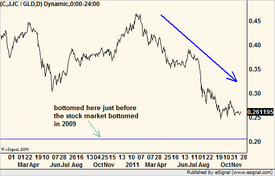 Here is another one of those ratios derived from the markets and not from some analysts’ guesswork. This one is the copper/gold ratio in the form of the JJC copper ETN divided buy the GLD gold ETF.