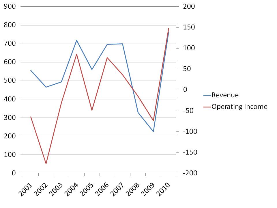 But while this is a strong company in a growing field, KLIC trades for a P/E of just 5, despite having more cash than it does debt! As such, on the surface this company looks like an absolute steal. But investors shouldn’t ignore just how cyclical this business is. Consider the company’s revenue and operating profit numbers over the last ten years ($ millions):