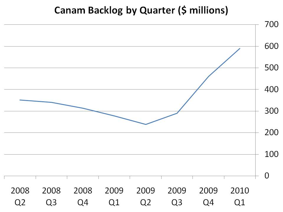 For Canam, booking rates have been out-pacing revenue, as the company’s backlog is now at a record level, though the company has been in existence for 50 years! The company’s backlog over the last several quarters is shown below: