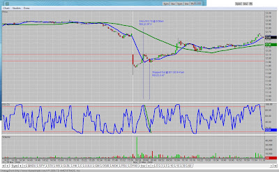 I actually pulled up all 22 charts from last week and made notations on each of them – but I will spare you and not post all of them. One of my main takeaways is that I’m chasing too much. Before going in, I decided to finally check out RSI(2) as a tool. Here are some commentaries on RSI(2) by Muddy, MarketSci and TradingMarkets. In short, a RSI using two days (2) may be better at detecting short-term trends than at the traditional fourteen day (14) intraveral. In general, a reading over 90 would mean overbought conditions, and under 10 would mean oversold conditions. In theory, one would want to avoid longs / enter shorts when overbought, and avoid shorts / enter longs when oversold. I haven’t really found a lot of reading about using RSI(2) intraday for day trading, but I assume the the same dynamic could hold true on short-time frame charts as it would on a daily chart, to the extent and limits that any indicator can be helpful, accurate and not too lagging or prone to false signals.