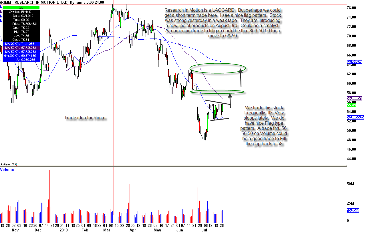 Research in Motion has an August 3rd new product launch. Stocks tend to like to run into those type events. This stock is a laggard and acts very sluggish, but I do get a nice trade here a few times a year.