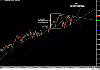 Since last Thursday we have been in the process of forming a ‘high-level’ triangle. The 30 handle width of the pattern from Thursday’s high to Monday’s low dictates a minimum measured move of about 25-30 points once it breaks. Key word being – BREAKS! Anticipating the resolving direction of a pattern can be a frustrating game, so be patient. Today we closed right at the top side trend-line and as I write this post the futures have just sold off several handles.