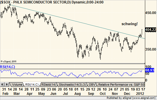 I took a look at the leading sectors in the market today (Wednesday) and just scrolled through their charts. Nothing fancy. What I saw in the home builders sure looked like it needed “schwing!” as its caption. Same for semis. And electrical components.