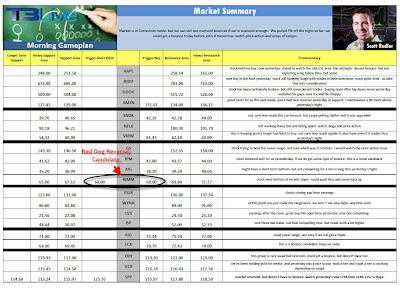 For all of you on the blog who are not subscribers on the site, I just wanted to give you a taste of my Morning Gameplan price point sheet that is part of the T3TV package on T3Live.com. Each morning at around 8:30 I upload the price point sheet so subscribers can look over my analysis and begin to build their strategy and gameplan for that day. One question people often have is when I list both the trigger buy and trigger short point at the same price. As highlighted on the sheet, that signals a RedDog Reversal set-up, where I will look for a push through that trigger price, and a trade back through it either long or short depending on the previous days’ action. I also go over the entire price point sheet in my Morning Call video on T3TV each morning. Let me know if you have any questions today.