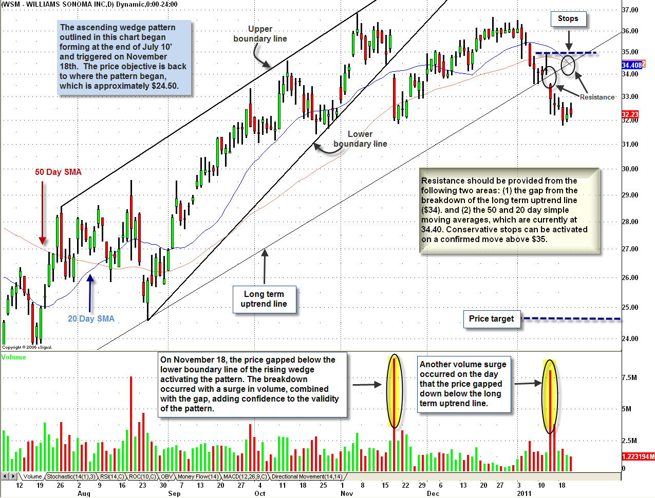 Williams Sonoma Inc. (WSM) began forming a bearish ascending wedge pattern at the end of July 2010. The pattern was triggered by a gap-down below the lower boundary line on November 18th, with added confirmation via a surge in volume. Adding to the bearish tone was a recent break of the long term uptrend line, on January 13th, also accompanied by heavy volume. The price objective is back to the lows of the pattern, which is $24.50.