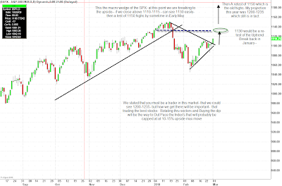 The S&P broke its wedge to the upside. Today we are opening near 1,120, with big resistance checking in at 1,130. I do think we test that level this week! Then, at some point, if the composure stays in tact, a move through the old highs of 1,150 should happen by MAY.