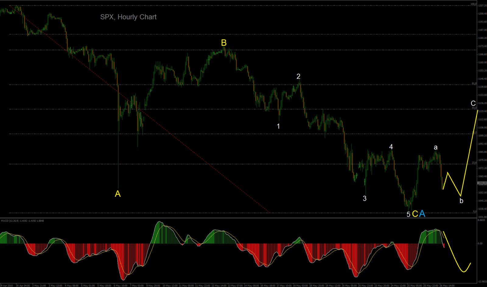 Very risky because it is against of daily MACD, but potentially looking it tomorrow from SPX 1040 or from double bottom. In ideal terms b wave retrace 86.2% which is around 1040 level.