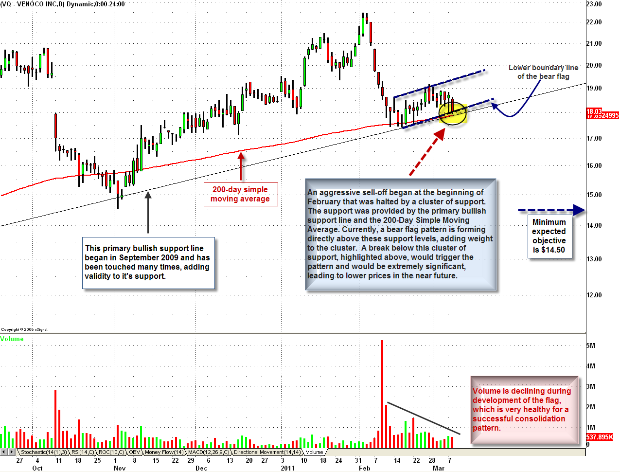 Venoco Inc. (VQ): An aggressive sell-off began at the beginning of February that was halted by a cluster of support. The support was composed of the primary bullish support line and the 200-Day Simple Moving Average. Currently, a bear flag pattern is forming directly above these support levels, adding weight to the cluster’s evidence. A break below the cluster would trigger the pattern and be extremely significant, leading to lower prices in the near future. Trigger: Daily close below the trend line, moving average and lower boundary line of the flag, currently around $17.90. Target: $14.50 is the minimum expected objective, measured by the pattern. Protective Stops: can be triggered on a daily close above $19.