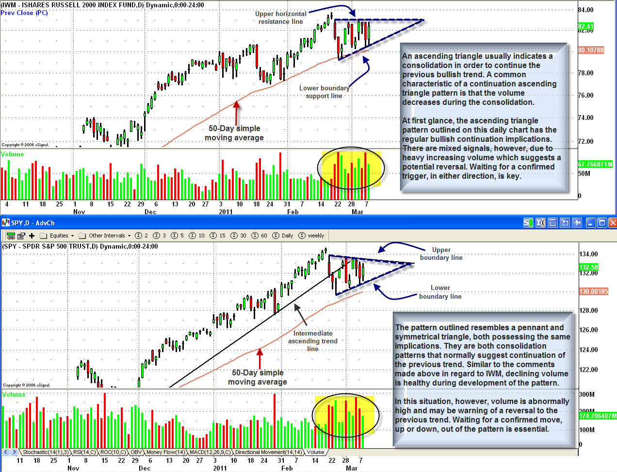 The major market indices have been in a volatile range for the past two weeks. Consolidation patterns are present on the daily charts which suggest continuation of the previous uptrend. The volume patterns, on the other hand, are implying potential bearish reversals. Both the SPDR S&P 500 Trust (SPY) and iShares Russell 2000 Index Fund (IWM) are close to a range resolution, via a pattern break, since the boundary lines of their consolidation patterns are converging and the range is narrowing. Waiting for a confirmed trigger, in either direction, is key. Below are charts outlining the consolidation patterns in SPY and IWM, followed by a short idea in Venoco Inc. (VQ).
