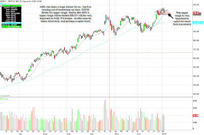 The Banks had four up days in a row and need to digest–we have to see how much of a pull in they have in order to consider them for another move higher. Goldman Sachs (GS) had a 4 day upmove, leading the entire sector, and rightfully took yesterday off. The group held strong despite the downgrade by Meredith Whitney. As long as Goldman holds over half of that upmove, we will buy the dip and add as it breaks above the new range.