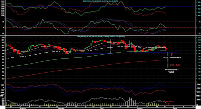Of the 17 data sets this chart presents, there is only 1 that is bullish, and that’s money flow, which has been diverging the past 4 days. One saving grace for the bulls, which I have not illustrated, is that by default, the right shoulder of this pattern always emerges as a symmetrical triangle. And by default, if prices squeeze past the 2/3 mark approaching the apex where the two points meet, then equilibrium between buyers and sellers has been achieved and prices will flat line. So there could be a big break in either direction; or there could be nothing, just a flat line. Perhaps a head fake below the 100-day Exponential Moving Average at $195 to clear out some stops, followed by a sharp reversal maybe? This should be interesting to watch over the next few days. And forget you not; AAPL has a huge impact on the market. Where AAPL goes, so goes the market. For now.