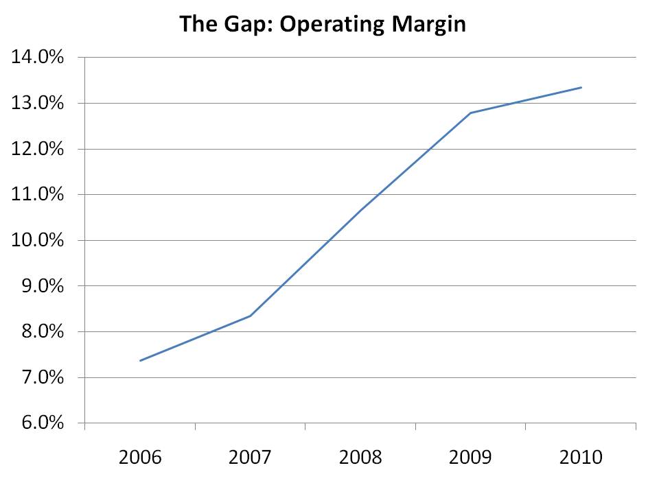 This is a rare sight indeed. Usually, when sales fall (especially same-store sales), operating income falls by a larger percentage, as fixed costs (e.g. rent, administrative staff etc.) stay stable. But management of The Gap has actually been able to reduce costs at a faster rate than its reductions in revenue. As a result, The Gap’s operating profit margin (which measures a company’s operating profit per unit of sales) has increased steeply, as per the chart below: