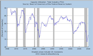 Note in the accompanying chart that capacity utilization continues to decline throughout the whole period since the late 1960s. Obviously, cycles in this measure took place that were related to the various recessions occurring during the time span, but each new peak in capacity utilization never exceeds the peak it had reached in the previous cycle.
