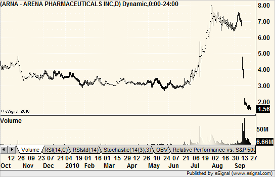 Arena Pharma – This sector is always jumping on news or lack thereof. This one had FDA stuff pending and then it was not granted. Ouch!