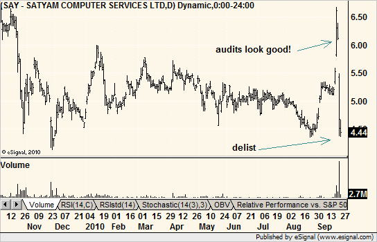 Satyam Computer – This one was an Internet darling from India way back when. Supposedly, management liked the auditing reports but a few days later they say they would delist US-based shares. Doh!