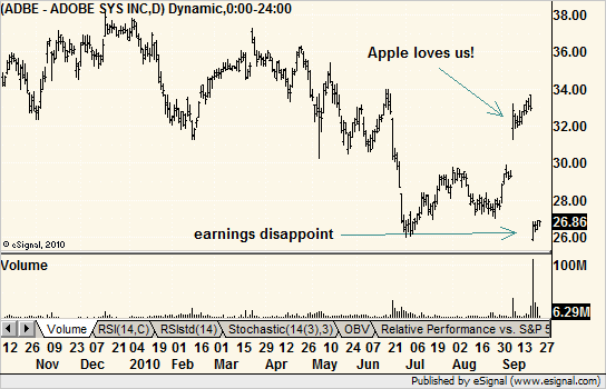 Adobe Systems – Jumps on news Apple will let them in on the iPhone gravy train and then they release their numbers. How is the small investor supposed to cope? Not stop orders. Options? How about cash at zero percent. At least you won’t lose.