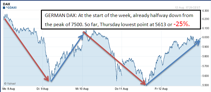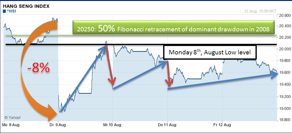 The Hang Seng had its worst day in years – and as the graph demonstrates – has yet to recover from this onslaught. Intraday, the index opened -8% down, recovered some 6% (to the low of the previous day) only to be rejected just there and fall another 3% into the close. The Wednesday saw again a gap down opening and a rebound – and lastly, through Thursday and Friday some steadiness returned. However, one could also say that all sellers had left the pit and no buyers had come forth, ultimately resulting in a uneasy stalemate. Significantly, the index could not break through the low of Monday, 8th, – and the 50% retracement of the total downside in 2008 is very close by, forming a strong resistance for early future bullishness. 50% Fibonacci is a rather ambivalent level as it does not necessarily direct the markets as unequivocally as the 38.2 or 61.8 level does. In other words, it could allow the markets to recover provided there is sufficient momentum, but it could also hold back any further advance if the support of traders is lack lustre.
