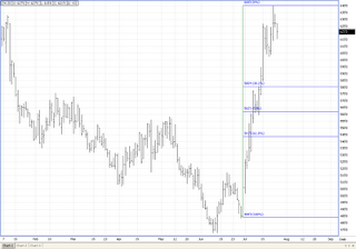 Third Chart, New Crop Wheat, shows we are taking a pause for the cause. I never like chasing markets, especially when the up move is attracting attention from the general media. I recently had a prospective client call in asking how he could get long wheat “for the next 5 years”… A very bullish sentiment from someone new to trading. That usually means that somewhere out there is a sentiment bouncing around that wheat is going to be the next tulip mania. Apparently, word of a drought in Russia, the worst in 130 years, is giving fuel to the fire. Add to that that the public has not had a good bull story to sink its teeth into for quite some time, and we have a recipe for an emotionally driven bull market.